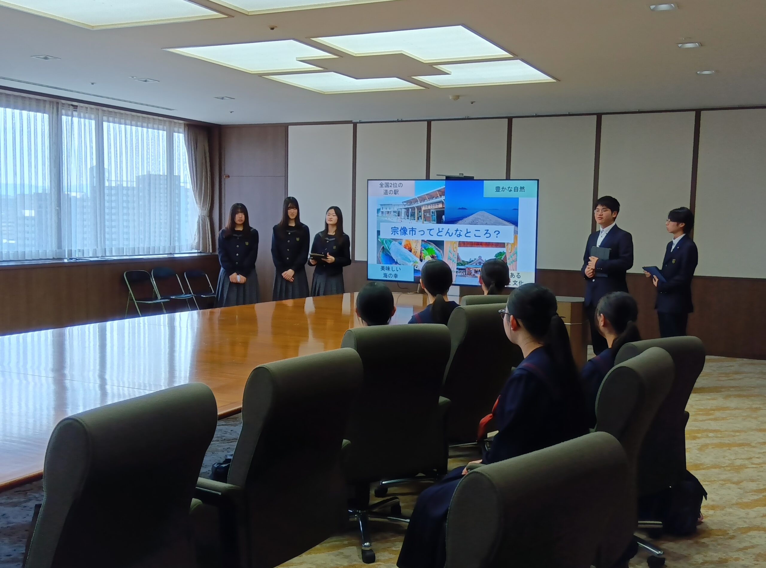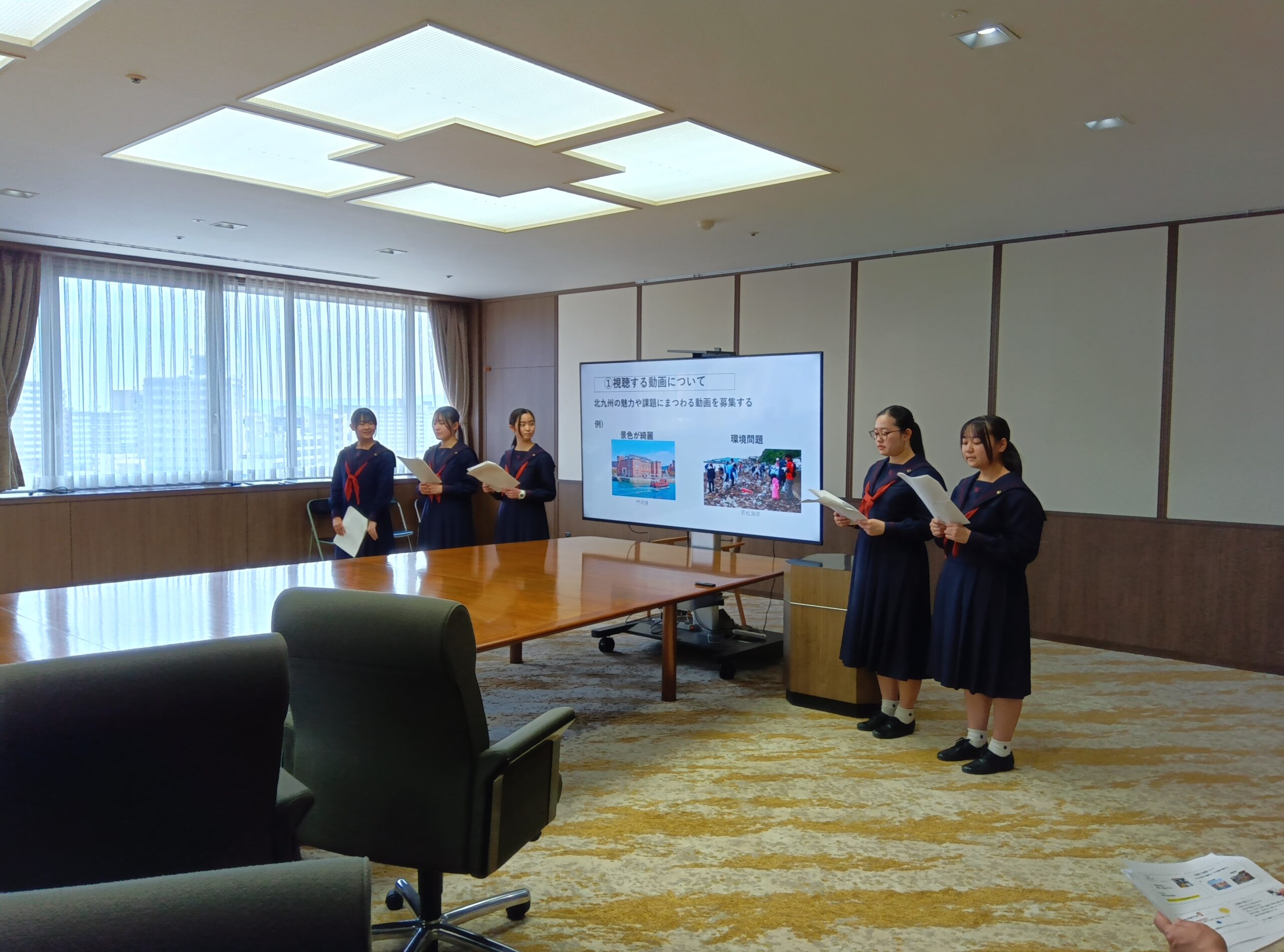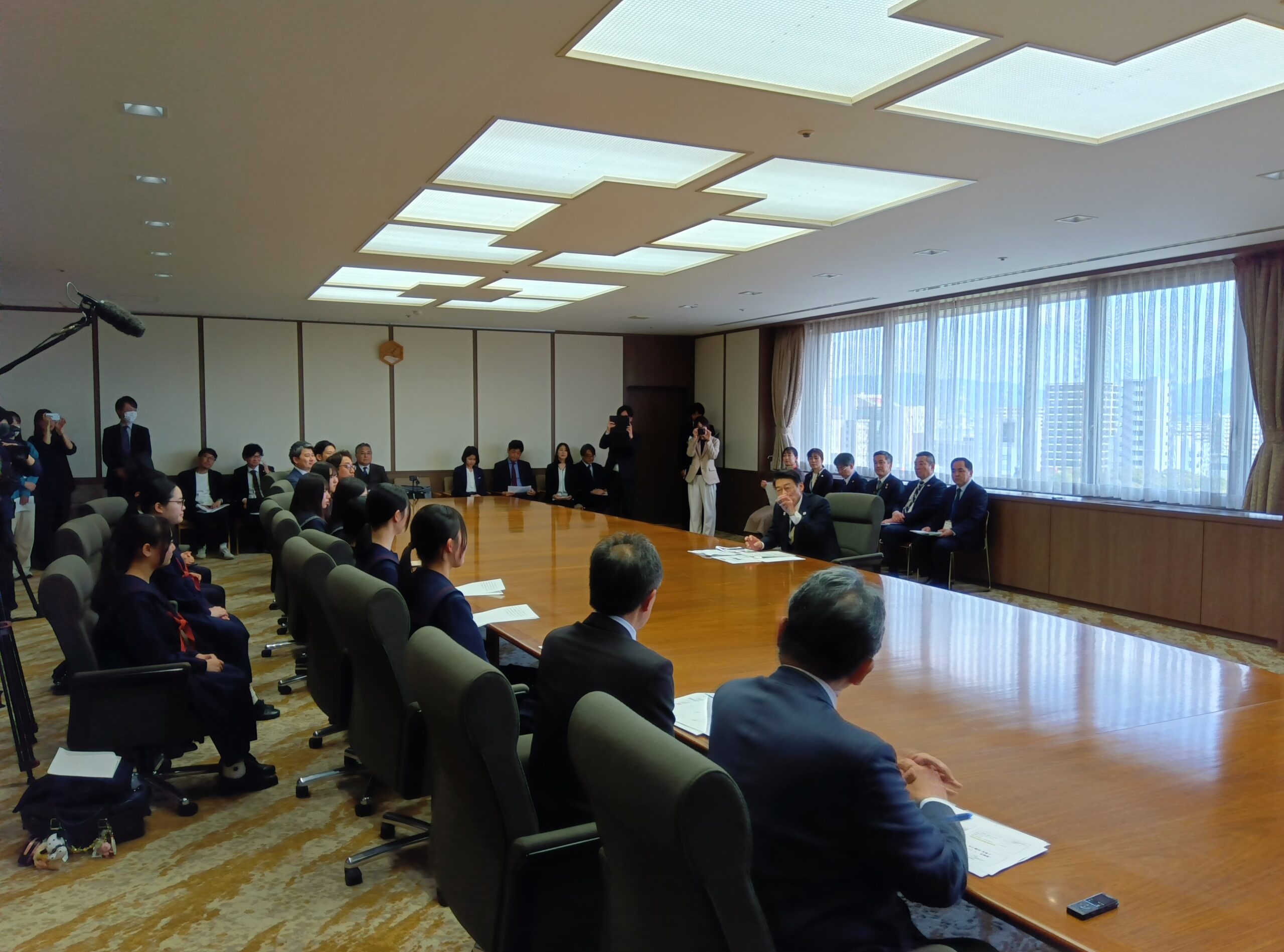 報告会では、「持続可能な九州・福岡県のために、自分達は何ができるか︖」をテーマに約半年間で取り組んだ成果を西南女学院高等学校及び八女学院高等学校の生徒が服部知事に報告しました。