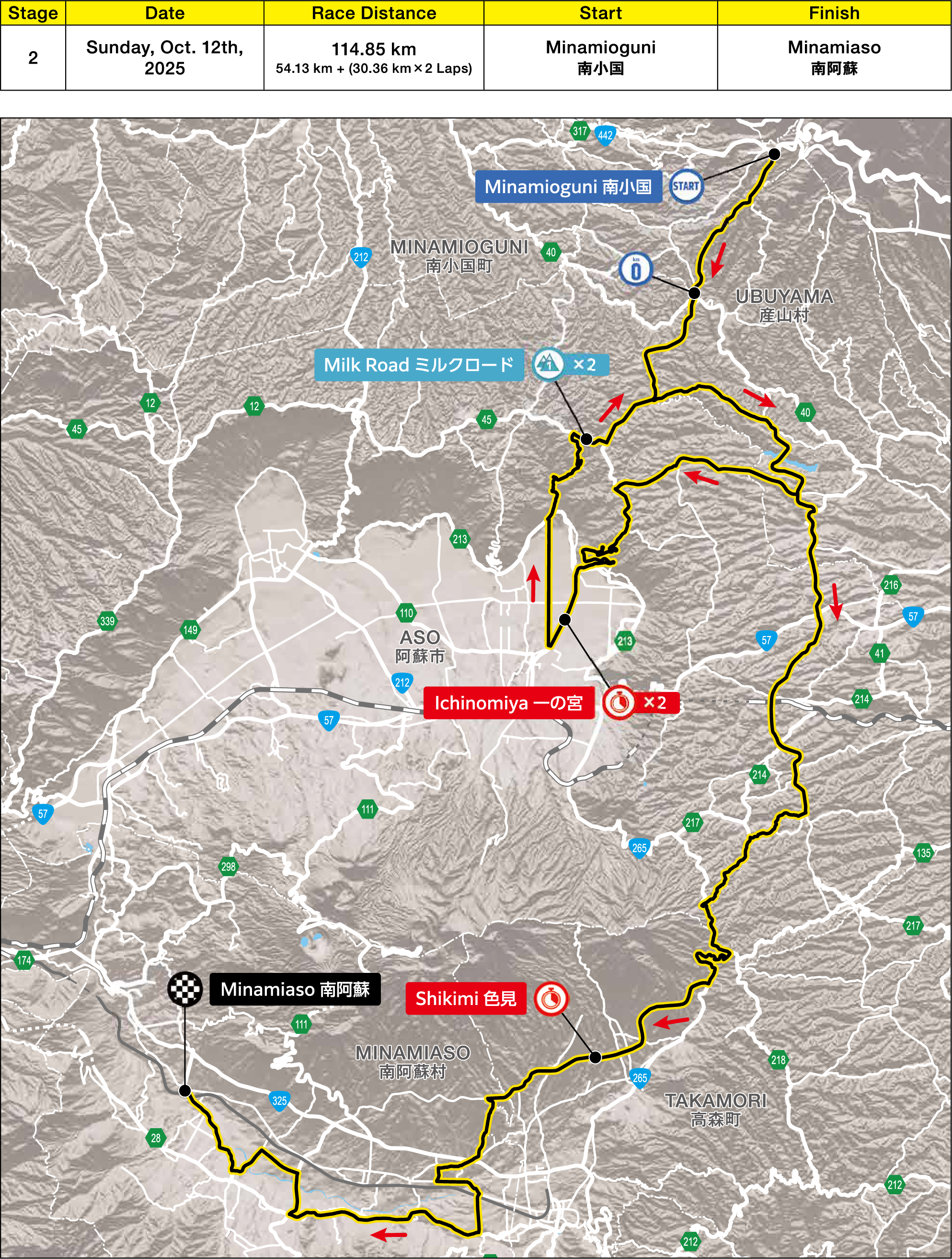 瀬の本レストハウスをスタートし、周回コースを2周、南阿蘇村役場でフィニッシュする、国内屈指の景観を誇るラインレース。