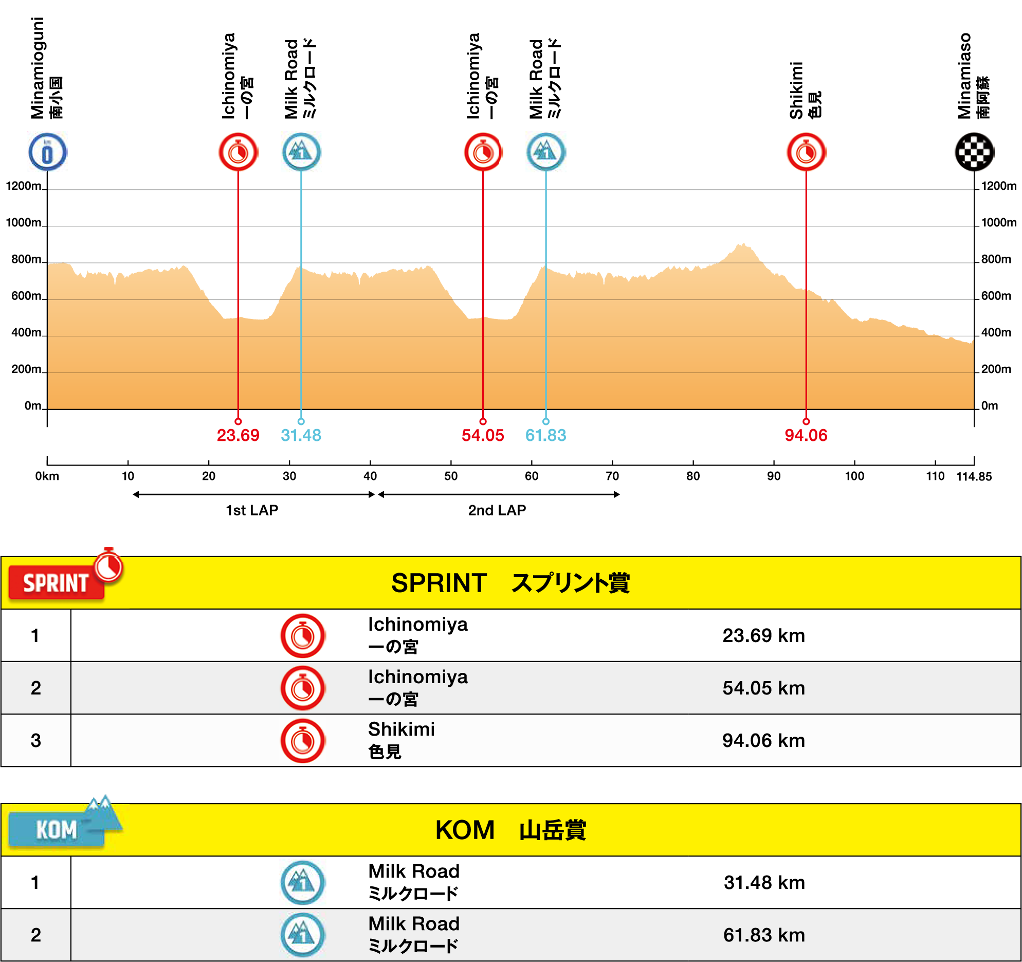 114.85km (54.13km+30.36km×2 LAPS)