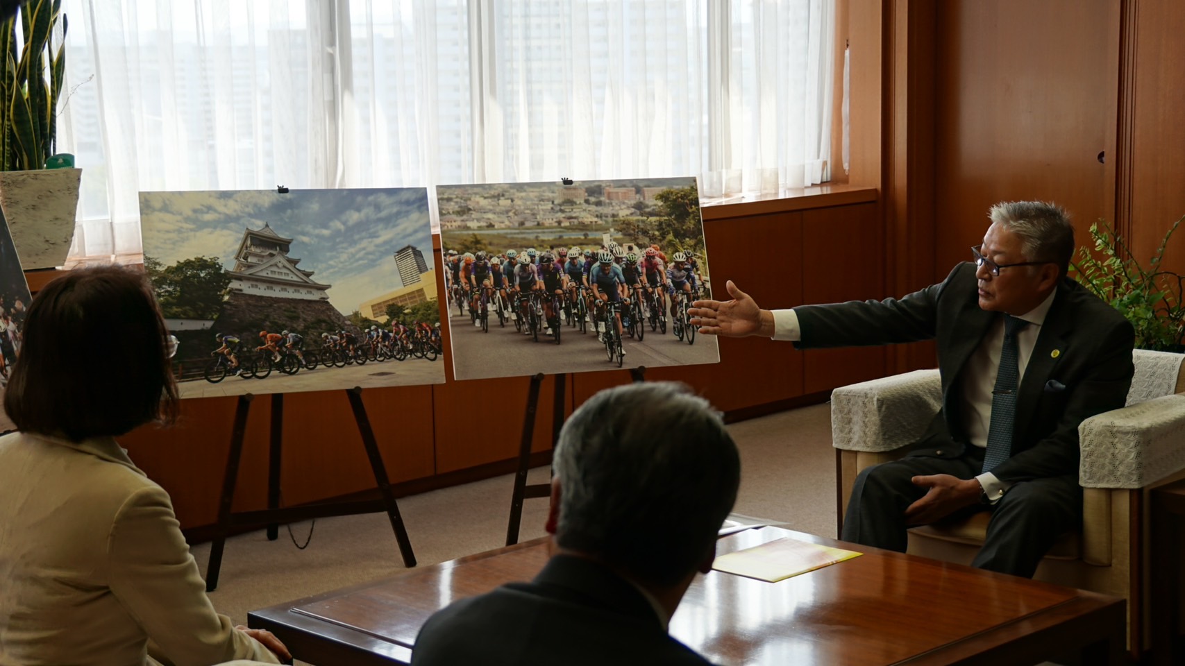 At the presentation ceremony, Mr. Horie, Director of the Tour de Kyushu Association (Executive Managing Director of the Kyushu Economic Federation), handed over a certificate to Vice Governor Oomagari of Fukuoka Prefecture.