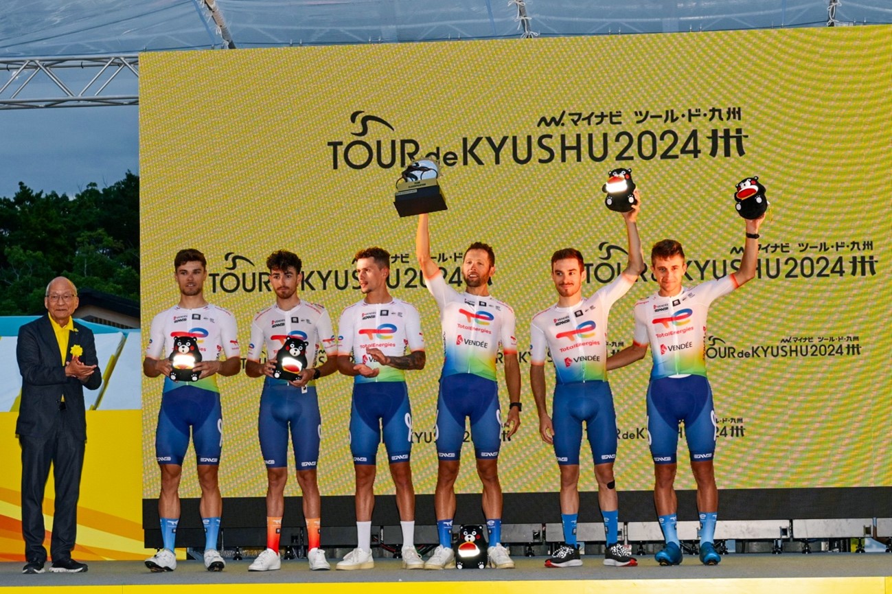 Sumio Kuratomi, Chairman of the Tour de Kyushu 2024 Executive Committee (left), and Team General Classification Winner, TotalEnergies