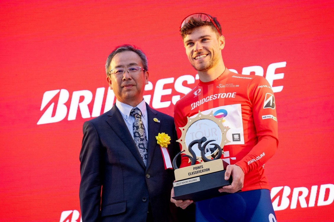 Akihiro Nagasawa, Head of the Kyushu Production Division at Bridgestone Corporation (left), and Points Classification Winner, Emilien Jeannière (TotalEnergies)