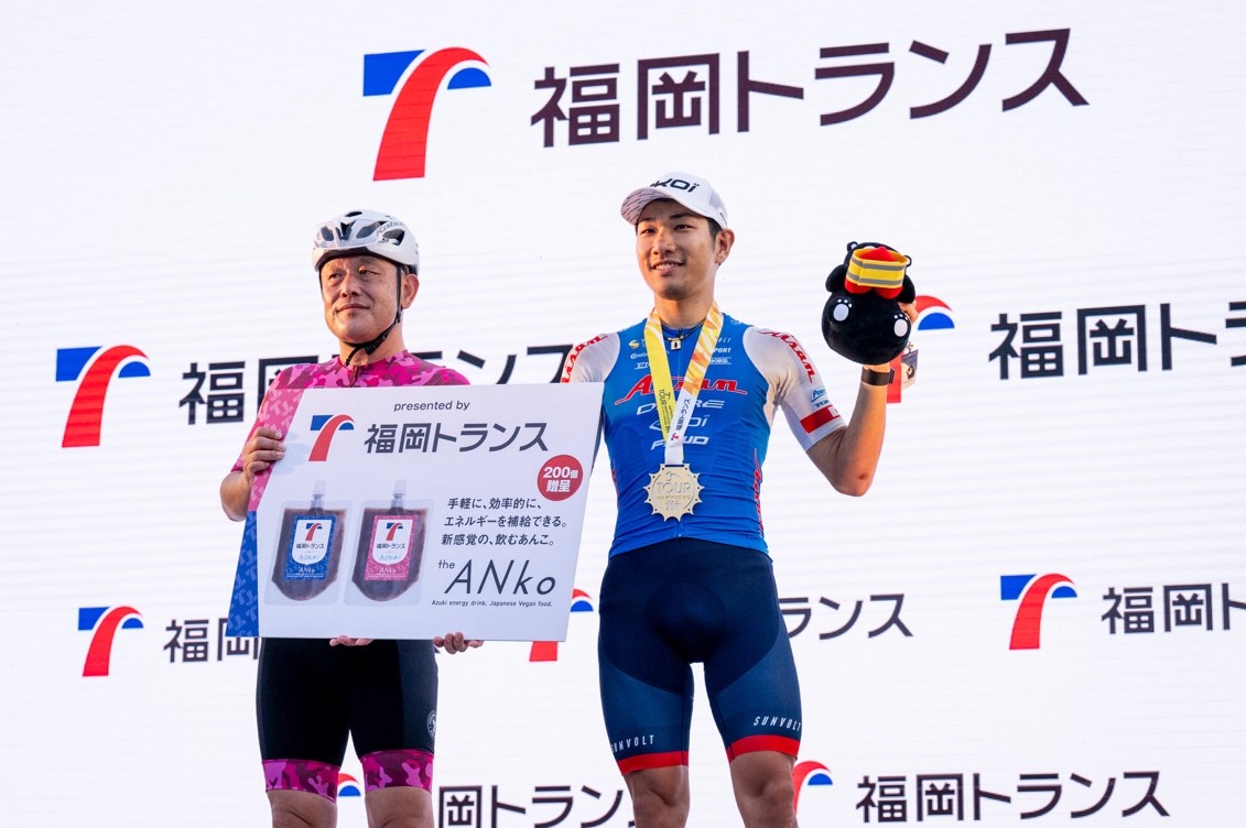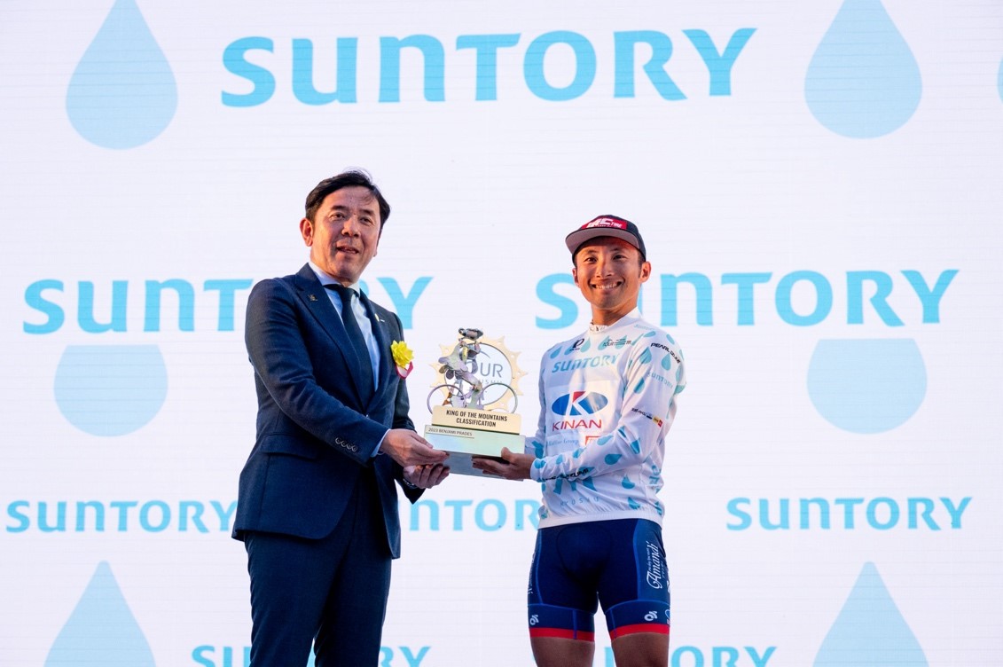 Hiroshi Morimoto, Executive Officer and Head of the Kyushu Branch at Suntory Foods Ltd. (left), with Mountains Classification winner, Genki Yamamoto (Kinan Racing Team)