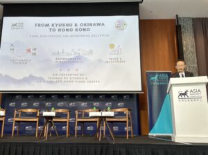 A panel discussion was held on Monday, October 28th, at the Asia Society Hong Kong Center, focusing on initiatives for transitioning to a sustainable society in Kyushu and Hong Kong. Topics included sustainable tourism, business and investment opportunities in Kyushu, and efforts to foster sustainable tourism. The event also introduced the theme, “Make Kyushu Sustainable – For a Sustainable Future in Kyushu”, as part of these initiatives.