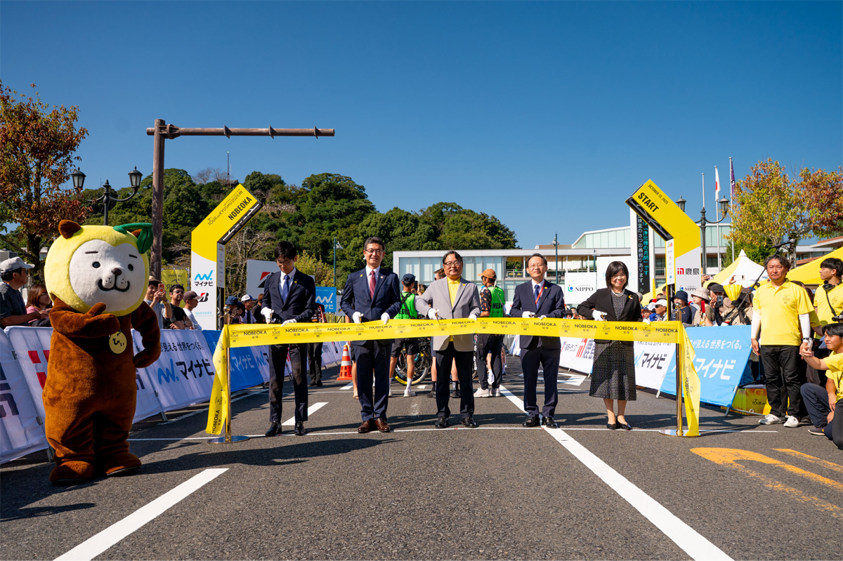 Ribbon-cutting ceremony: from left to right — Hisatomo Miura (Mayor of Nobeoka), Shunji Kono (Vice Chair, Tour de Kyushu 2025 Organizing Committee), Kazuhiro Ikebe (Chairman, Tour de Kyushu 2025 Organizing Committee), Ryutaro Kuwata (Vice Governor of Oita Prefecture), and Kuniko Tomitaka (Mayor of Saiki City). On the far left was Hi-kun, the Miyazaki Dog mascot.