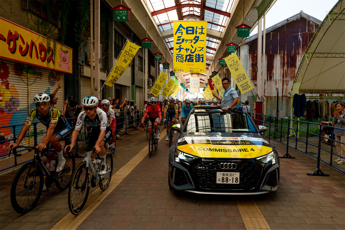 The peloton parades through Yamashita Shinten Street in Nobeoka.