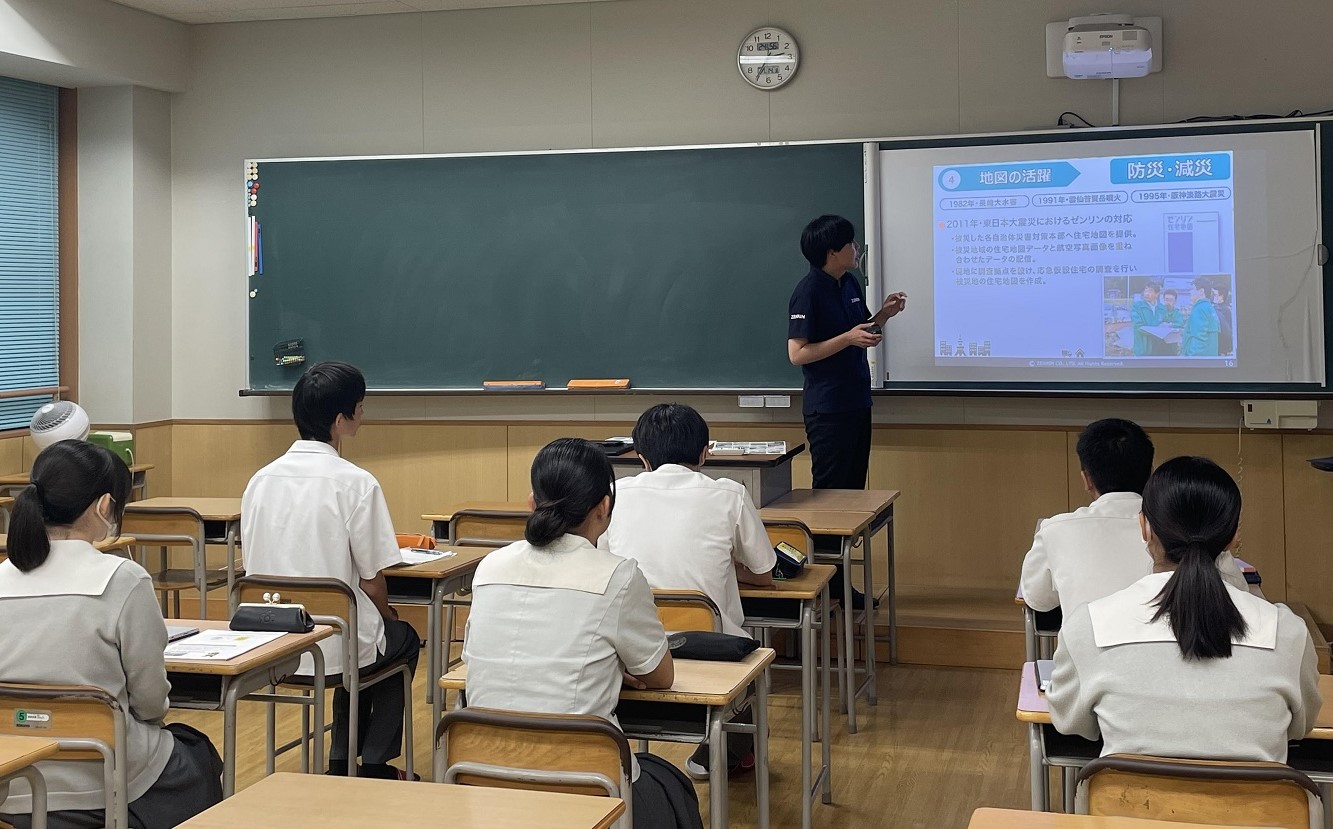 本プロジェクトの一環として、北九州市の九州国際大学付属高等学校と、株式会社ゼンリンによる探求学習の授業風景