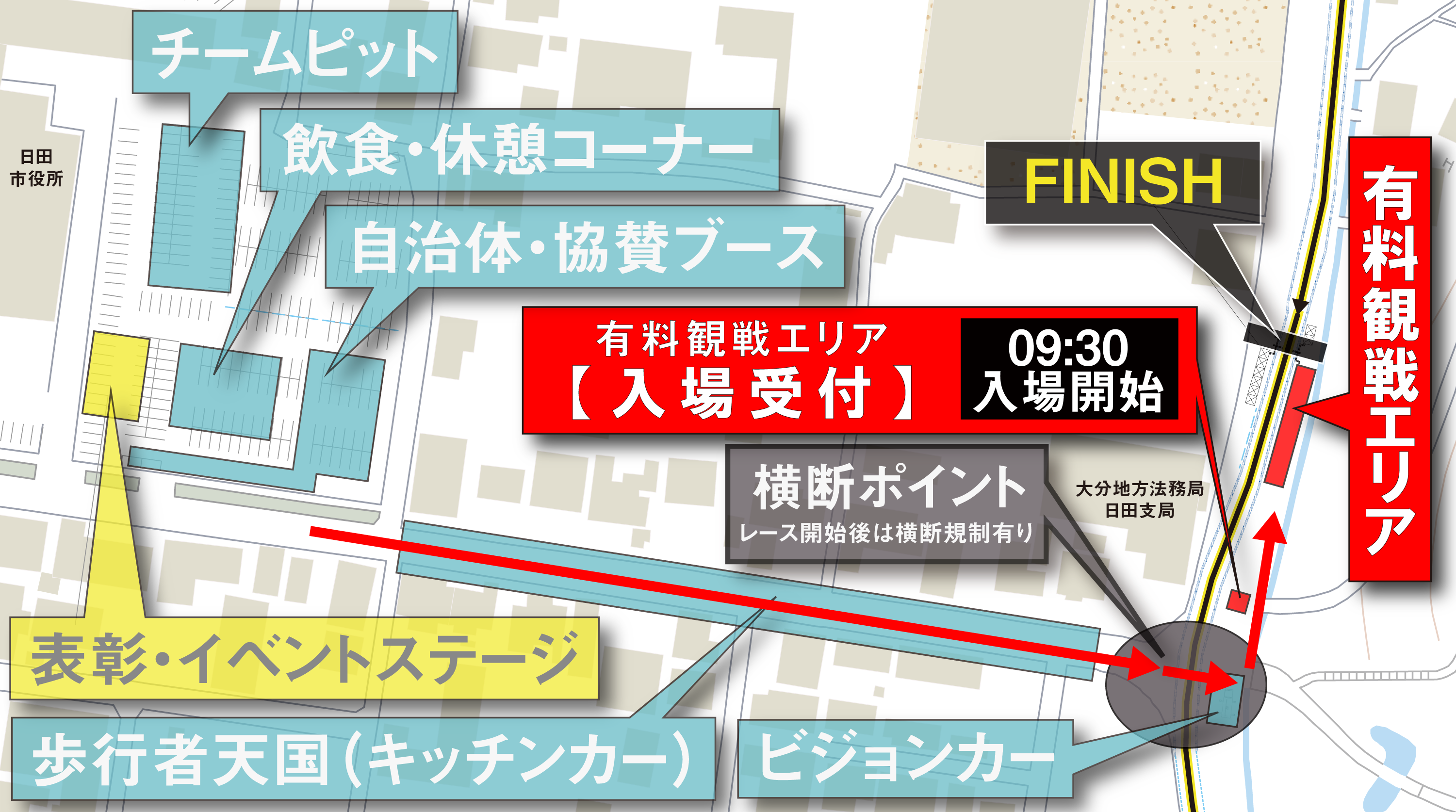 ・交通規制が始まる11:30からレース開始の13:00までは、スタッフの誘導により道路を横断してください