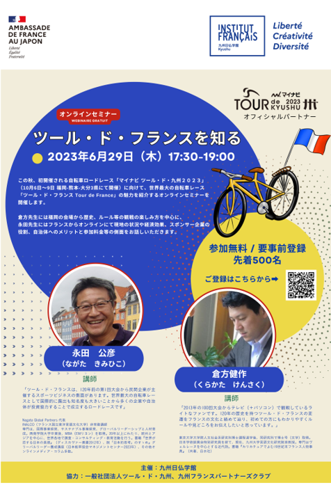大会のコンサルティングパートナーであるアンスティチュ・フランセ九州の主催で、世界最大の自転車レース「ツール・ド・フランス Tour de France」の魅力を紹介するオンラインセミナーが開催されます。