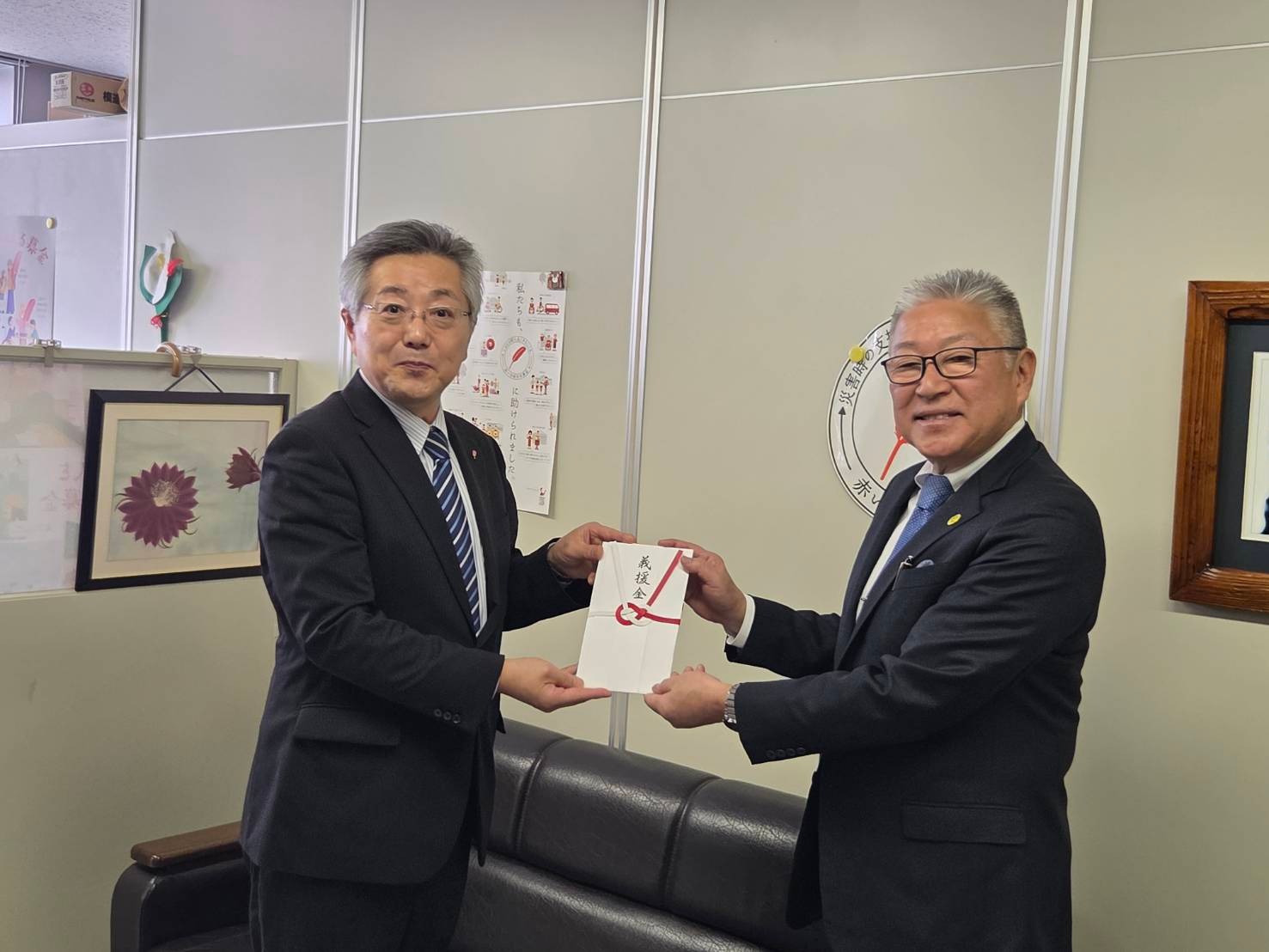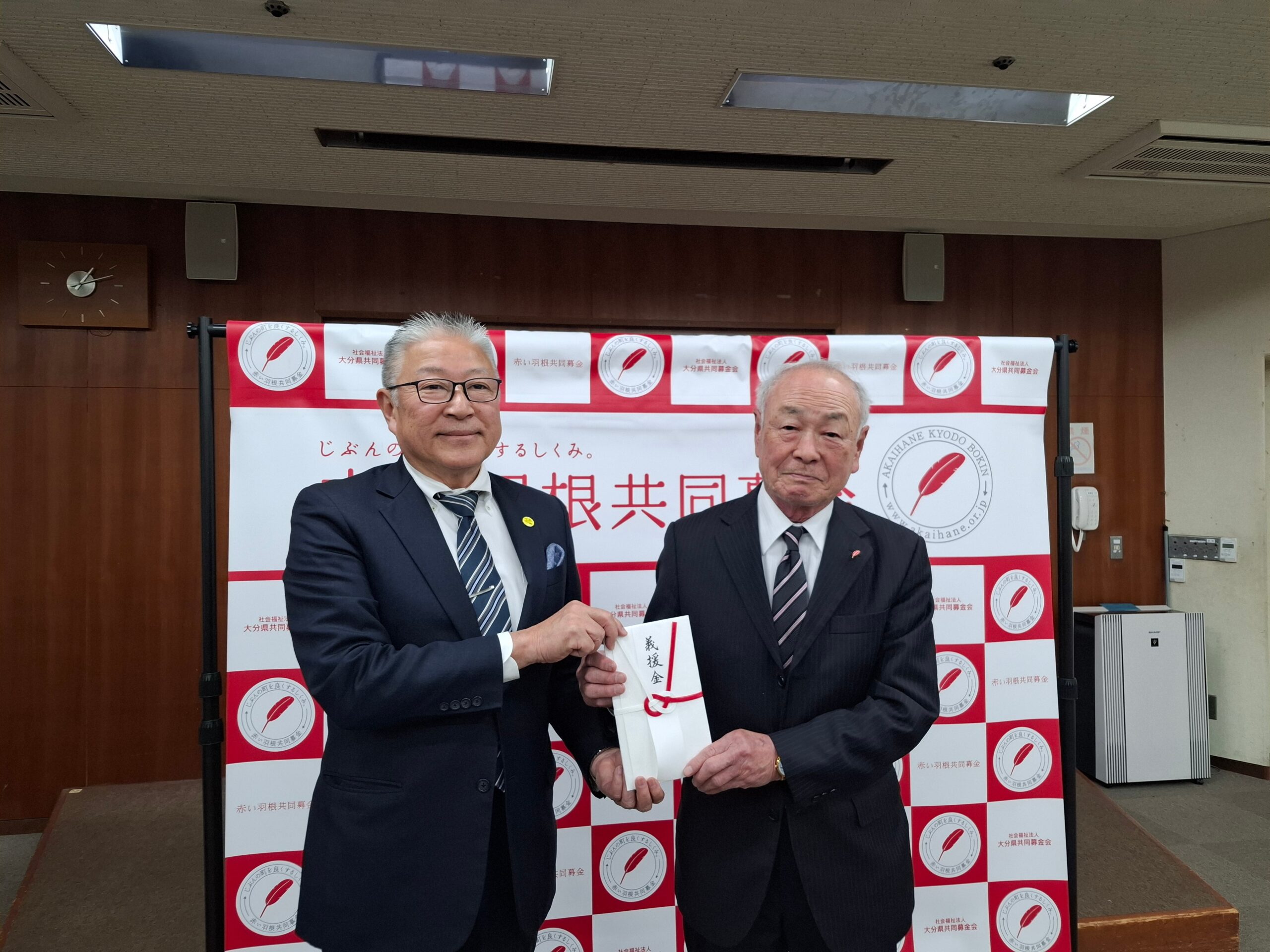 3/6(金)、大分県共同募金会副会長の大山義雄様に一般社団法人ツール・ド・九州理事長の堀江より目録を手交しました。