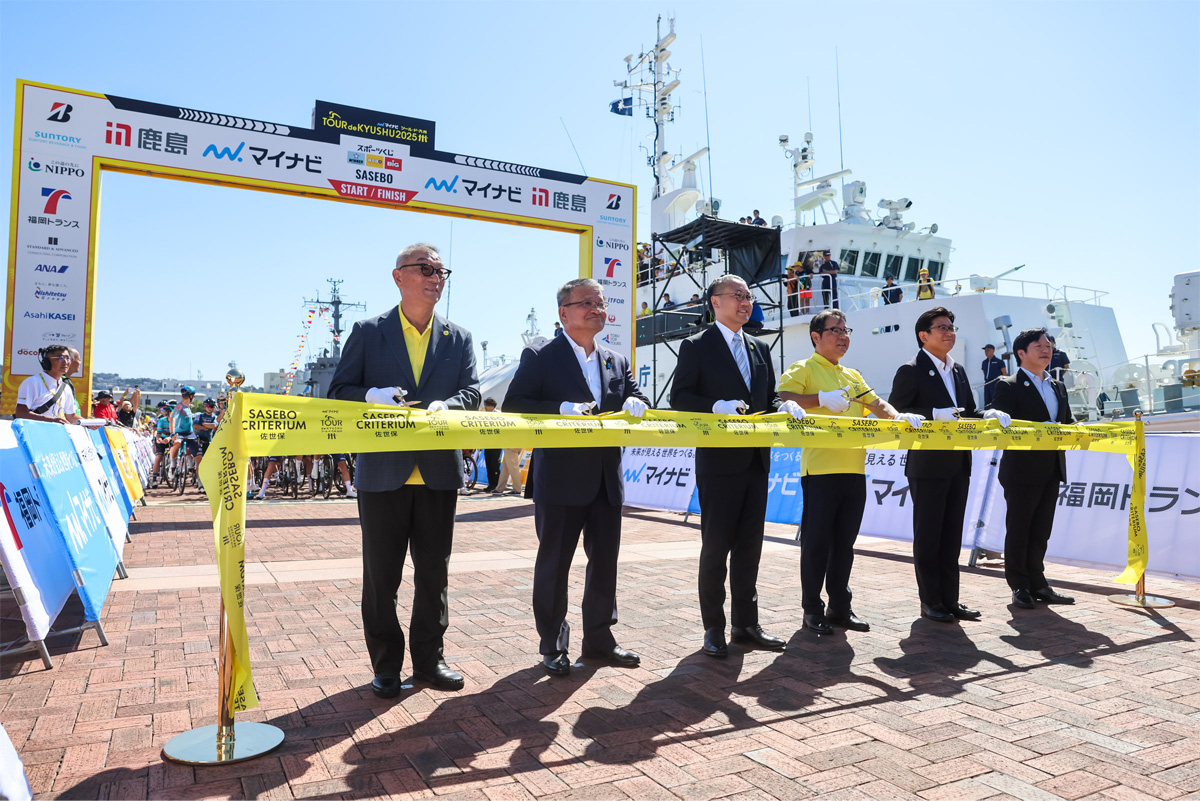スタートに先立ってテープカットが行われた。左から大会アンバサダーの中野浩一氏、外間雅広⻑崎県議会議⻑、大石賢吾長崎県知事、池辺和弘ツール・ド・九州2025実行委員会会⻑、宮島大典佐世保市⻑、久野秀敏佐世保市議会議⻑。