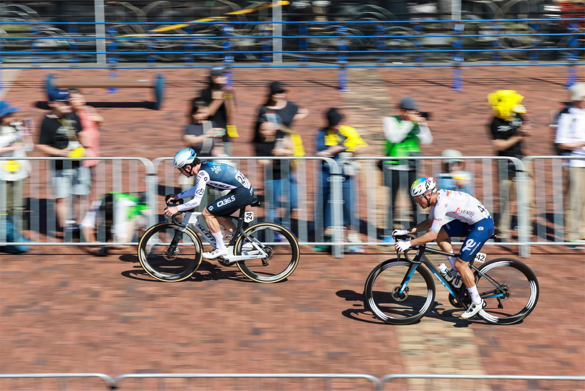 ジョゼフ・ピドコック(Q36.5プロサイクリングチーム)とアレッシオ・デッレ・ヴェドヴェ(XDS・アスタナチーム)のスプリント勝負はハンドルを投げ合う僅差に。