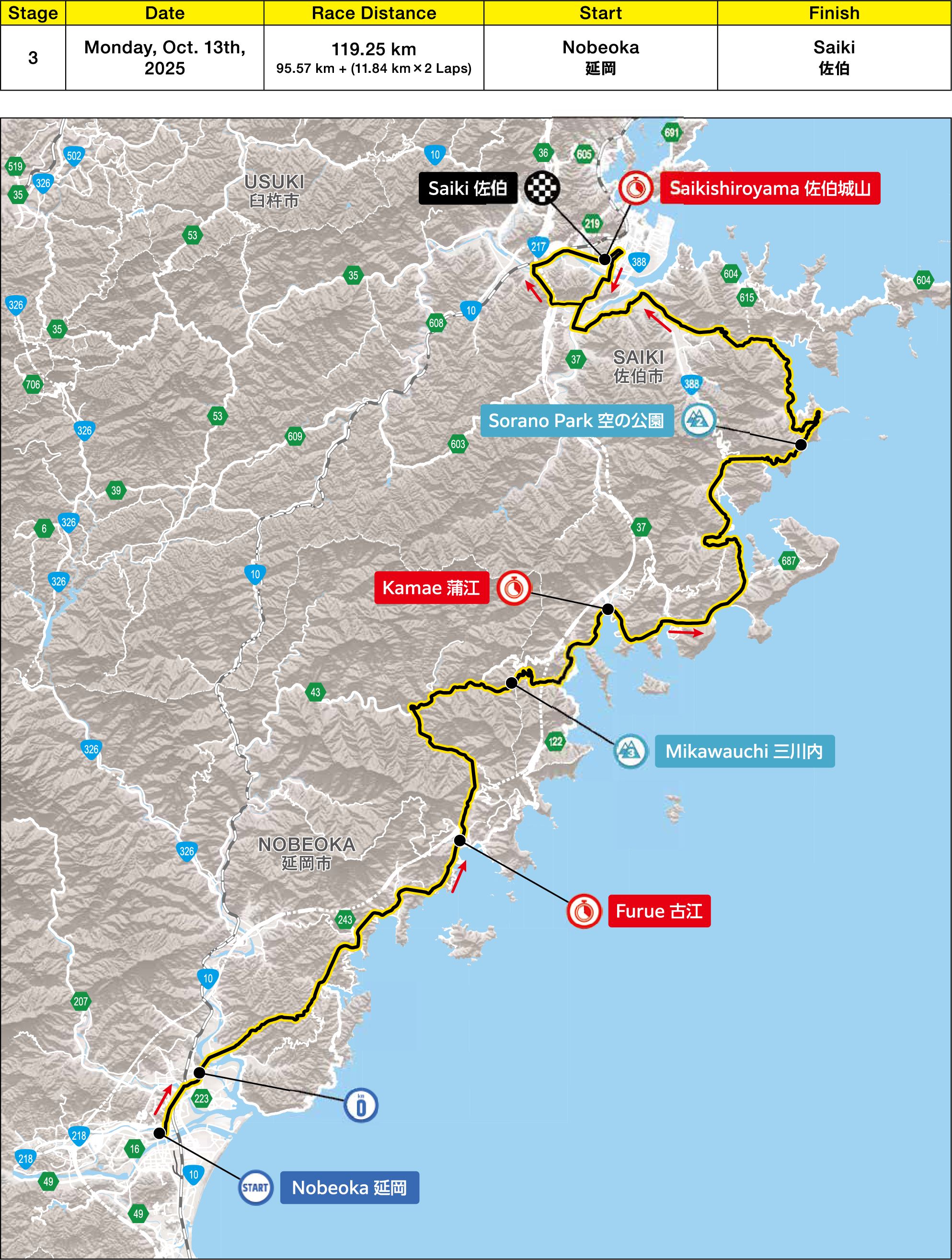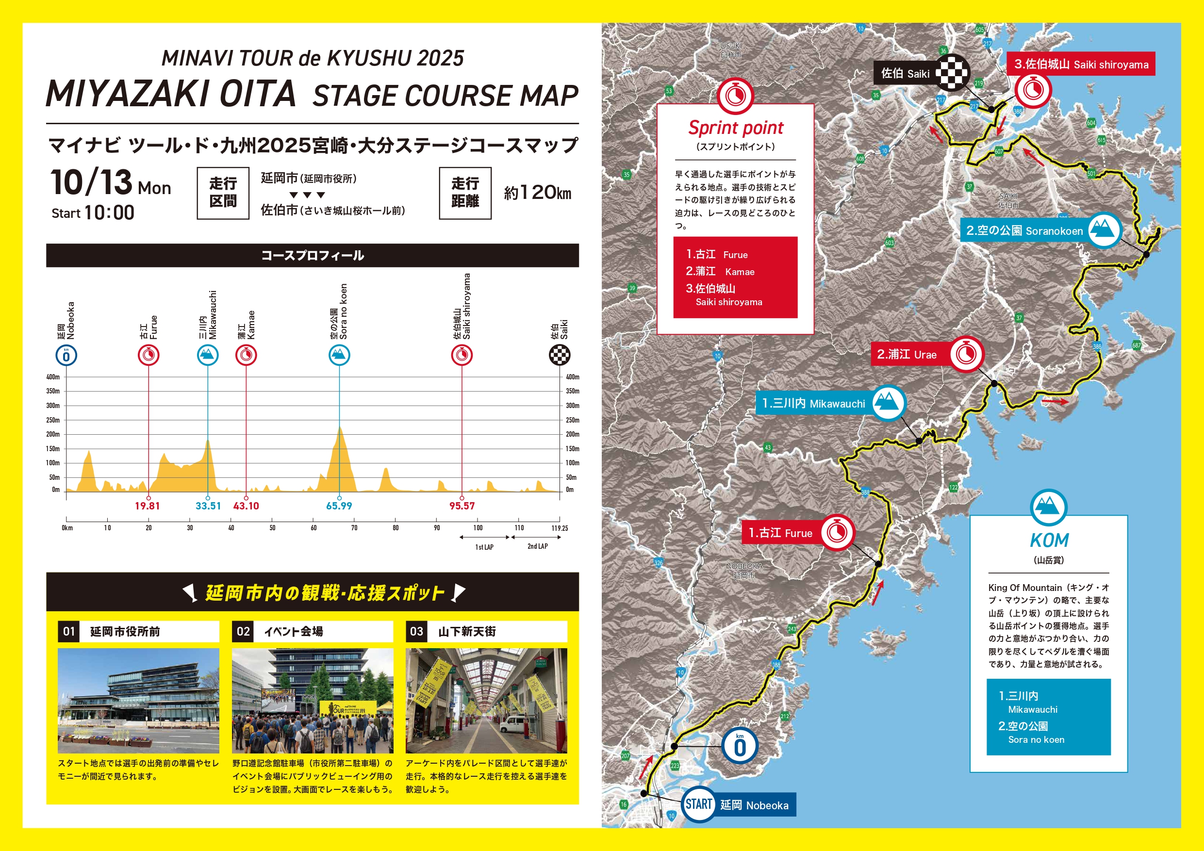延岡市ではスタートからアーケード通りの商店街を通るパレード走行、佐伯市では県内屈指の景観を誇る空の公園など見どころ多数。